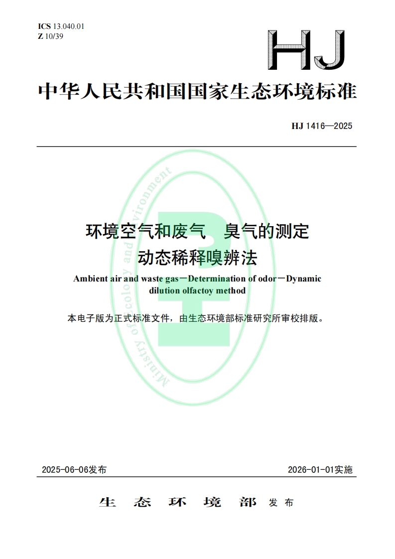 為規(guī)范環(huán)境空氣和廢氣中臭氣的測定方法,生態(tài)環(huán)境部近日發(fā)布了國家生態(tài)環(huán)境標(biāo)準(zhǔn)《環(huán)境空氣和廢氣 臭氣的測定 動態(tài)稀釋嗅辨法(HJ 1416—2025)》。本標(biāo)準(zhǔn)為首次發(fā)布,自2026年1月1日起實(shí)施。